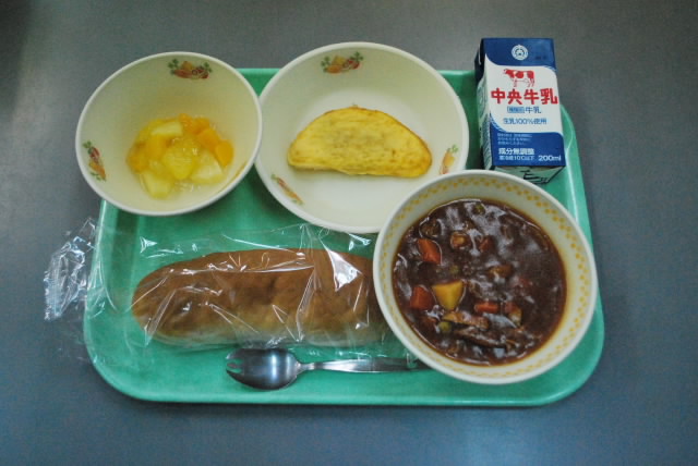 今日のメニューは、米粉入りロールパン・牛乳・ポークトマトシチュー・ツナ入りオムレツ・フルーツのゼリー和えです。