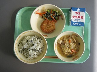 今日のメニューは、わかめご飯、牛乳、凍り豆腐の玉子とじ煮、かぼちゃコロッケ、小松菜のゆず和えです。